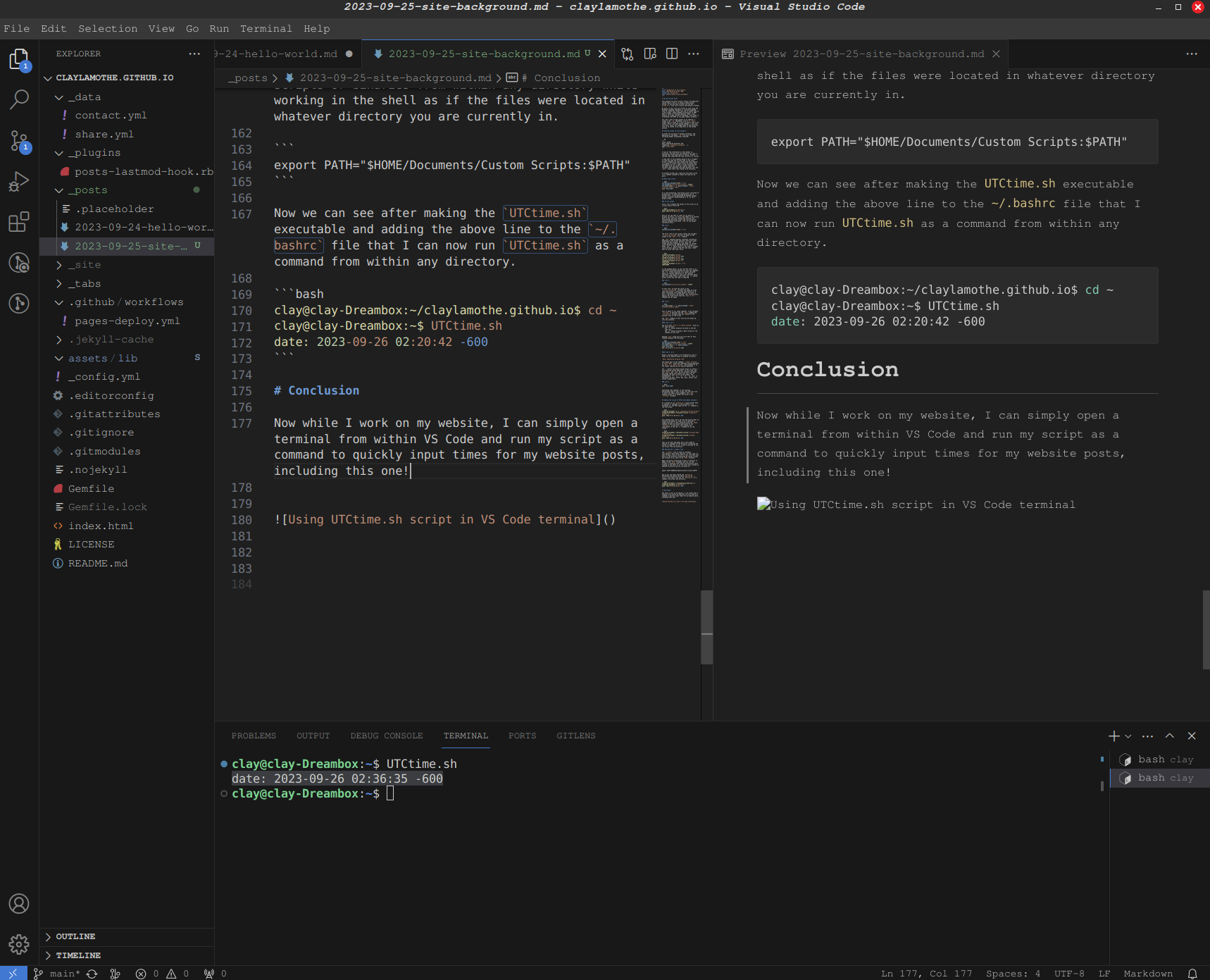 Now while I work on my website, I can simply open a terminal from within VS Code and run my script as a command to quickly input times for my website posts, including this one!